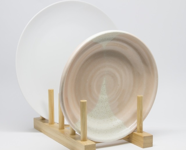 直径20cmを超えるようなプレート。重なっていると一番下を出すのは一苦労ですが、100均の木製やプラスチック製のディッシュスタンドに1枚ずつ立てるだけで、まるでショップのディスプレイのような見た目に。